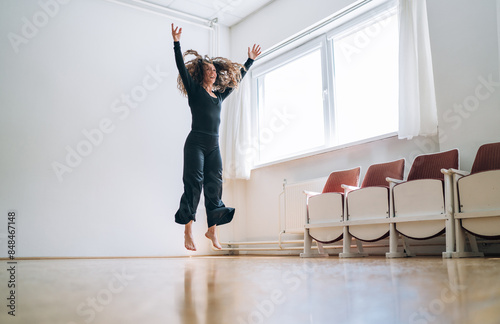 Fototapeta premium Woman in a black outfit gracefully jumping in a well-lit room, her movements fluid and expressive. Her curly hair flows as she extends her arms, embodying elegance and passion in her dance