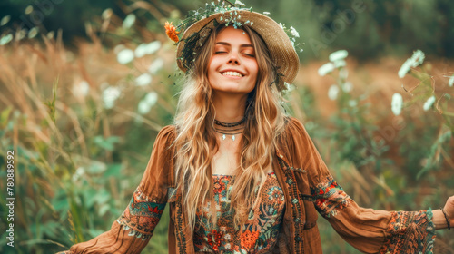 Fototapeta premium Woman in a bohemian dress and hat smiles joyfully among the greenery, embodying freedom and nature-love
