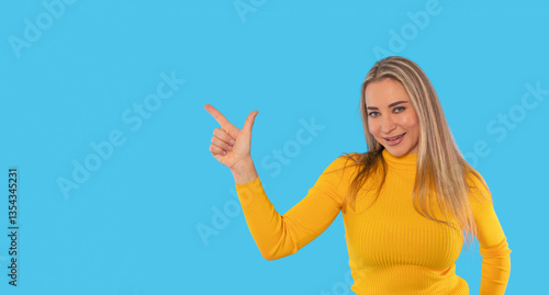 Fototapeta premium Woman in a bright yellow sweater points confidently with smile against a vivid blue background, showcasing a sense of joy and enthusiasm during a cheerful moment