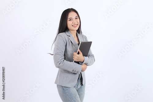 © Miftakhul Fariz, Fototapeta premium Woman in a gray suit and jeans is hugging a book. Business asian woman
