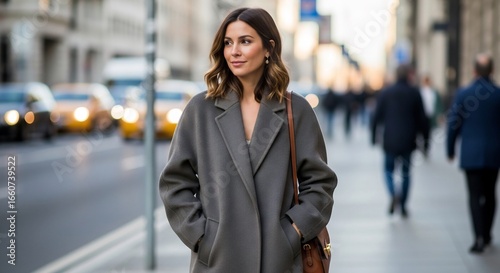 © muchrokim, Fototapeta premium Woman in a grey coat on a city street