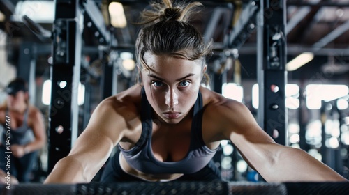 Obraz premium woman in a gym, performing a push-up exercise determined expression on her...