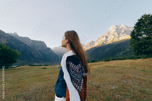 Fototapeta premium Woman in a meadow looks toward mountains in a wide landscape, wearing a patterned shawl; travel portrait of nature, solitude and serene outdoor exploration in golden light.