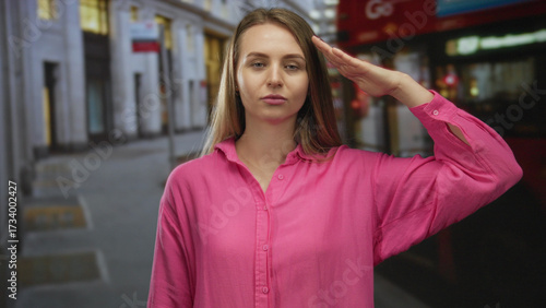 © Krakenimages.com, Fototapeta premium Woman in a pink shirt salutes on a city street with a double-decker bus in the background, capturing an urban and patriotic atmosphere.