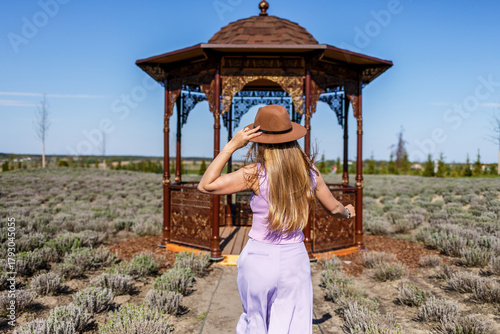 © DSMT, Obraz premium Woman in a purple dress approaches a charming gazebo surrounded by blooming lavender fields under a clear blue sky