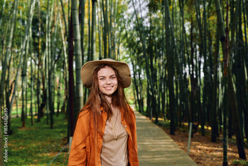 © SHOTPRIME STUDIO, Obraz premium Woman in a straw hat with a warm smile in a bamboo forest on a wooden path, portrait of a happy traveler wearing orange jacket, nature walkway with sunlight through tall green stalks.