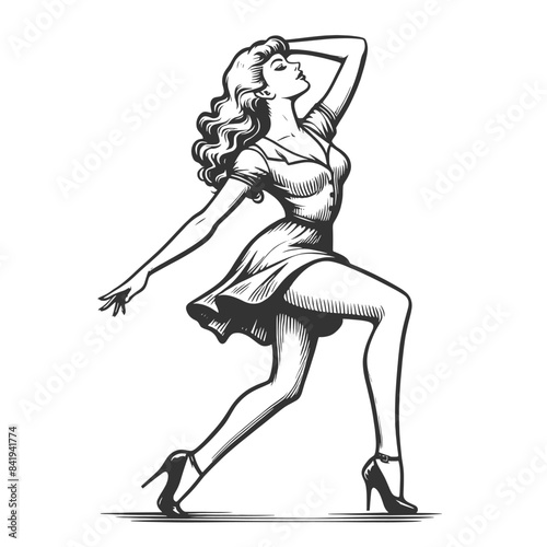 © Oleksandr Pokusai, Fototapeta premium woman in a vintage dress striking a graceful pose, capturing classic elegance and charm sketch engraving generative ai fictional vector illustration. Scratch board imitation. Black and white image.