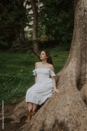 © Mila, Naklejka premium Woman in a White Dress is walking in a park, soft-focus trendy image.