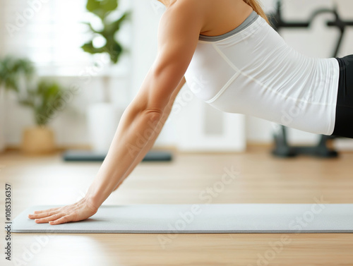 Fototapeta premium Woman in activewear performing a plank exercise on a yoga mat in a bright...