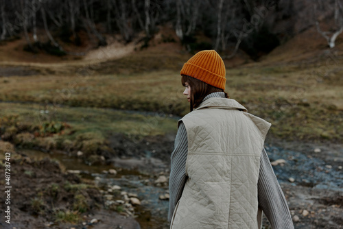 Naklejka premium woman in autumn clothes nature trees travel landscape
