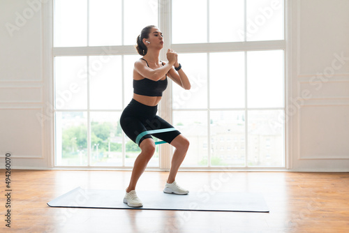 © Prostock-studio, Fototapeta premium Woman In Black Sportswear Exercising With Elastic Band