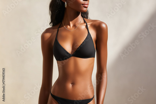 © Nyxoria, Fototapeta premium Woman in black swimsuit, minimalist jewelry, and radiant skin, captured in natural light against a neutral backdrop. Stunning!