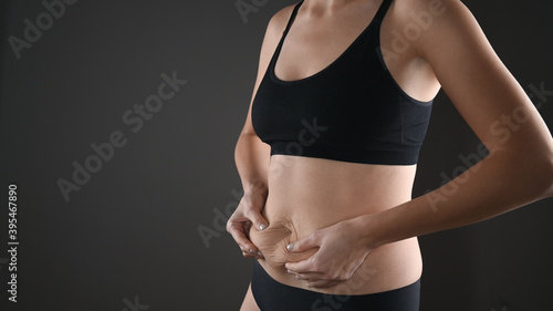 © Tatsiana, Fototapeta premium Woman in black underwear holding her fat belly, stomach with hands, diet, weight loss and liposuction concept. Isolated on grey background