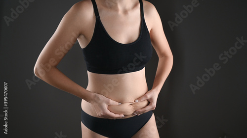 © Tatsiana, Fototapeta premium Woman in black underwear holding her fat belly, stomach with hands, diet, weight loss and liposuction concept. Isolated on grey background