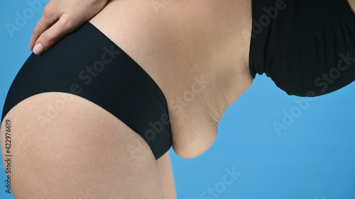 Fototapeta premium Woman in black underwear shows her belly fat on blue backdround. Body...