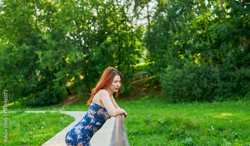 Naklejka premium Woman in blue dress leaning on bridge railing in park. Relaxation and rest concept as woman enjoying her time outdoors. Lush green surroundings. Girl has beautiful body.