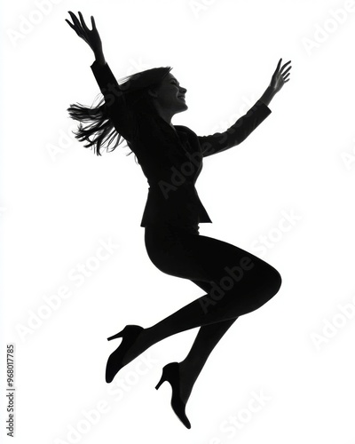 © Taras Vykhopen, Naklejka premium Woman in business attire jumping joyfully against a white background showcasing dynamic energy