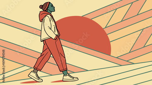 Obraz premium Woman in casual clothes walking with a sunset and geometric background in retro style illustration