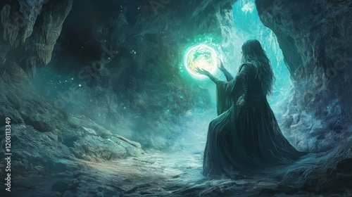 Fototapeta premium Woman In Cave Holding Glowing Orb Of Light