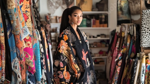 © Mas, Fototapeta premium Woman in Colorful Attire Surrounded by Textiles