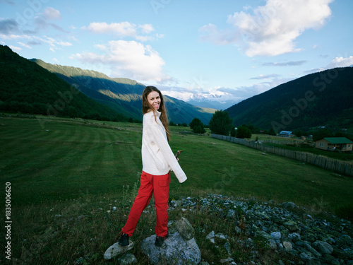© SHOTPRIME STUDIO, Fototapeta premium Woman in countryside field wearing whitesweater and redpants smiling near mountains under blue sky outdoors moment showcasing nature meadow rural scenery