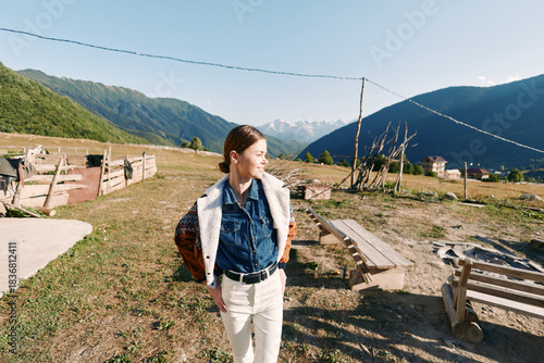 Obraz premium Woman in countryside with mountains and meadow, smiling outdoors while...