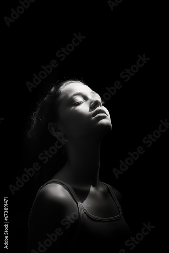 Obraz premium Woman in dark shadows looking up at a bright light with her eyes closed.