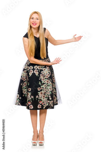 Fototapeta premium Woman in floral dark skirt isolated on white