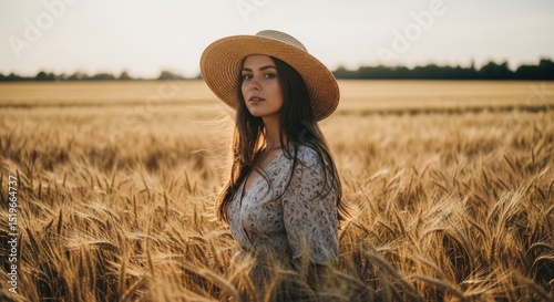 © Raphael, Obraz premium Woman in Floral Dress Standing in Wheat Field