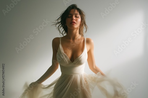 © Maria, Fototapeta premium Woman in Flowing Dress Stands Peacefully in White Minimal Space