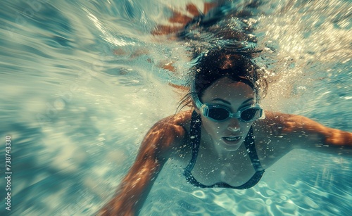 © goami, Fototapeta premium woman in goggles swims in swimming pool underwater, sport workout