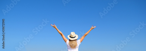© YAROSLOVEPHOTOVIDEO, Naklejka premium Woman in hat raised her hands against the blue sky