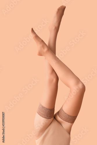 © Pixel-Shot, Fototapeta premium Woman in nude stockings on beige background