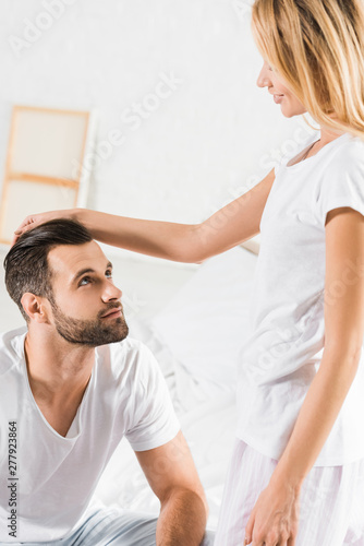 Fototapeta premium woman in pajamas stroking handsome man in bedroom