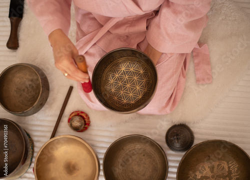 Fototapeta premium Woman in pink clothes hold sound metal bowl and make music in spa salon. Yoga for health, relaxation and meditation body, practice for forgiveness and spiritual harmony.