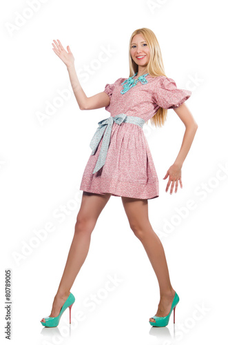 Fototapeta premium Woman in pink doll dress isolated on white