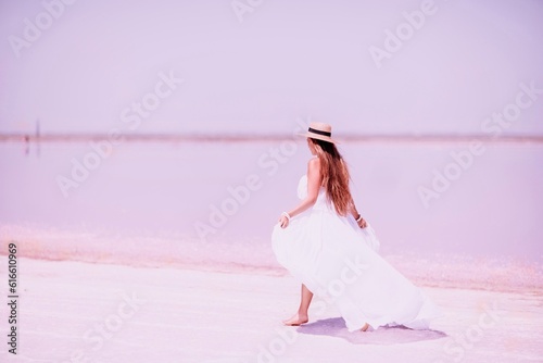 Naklejka premium Woman in pink salt lake. She in a white dress and hat enjoys the scenic view of a pink salt lake as she walks along the white, salty shore, creating a lasting memory.