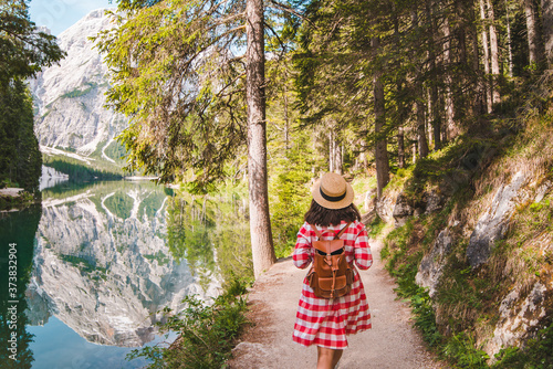 © phpetrunina14, Naklejka premium woman in red checkered dress walking around mountain lake