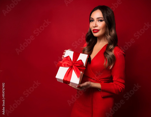 © fotoluigi868, Fototapeta premium Woman in Red Outfit Holding a Gift Box with Red Ribbon on Red Background- A woman dress_1(395)
