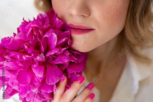 Fototapeta premium woman in shirt, holds bouquet of peonies in her hands. Surprise bouquet of flowers for date, mothers day or valentines day. Skin and lips texture close up