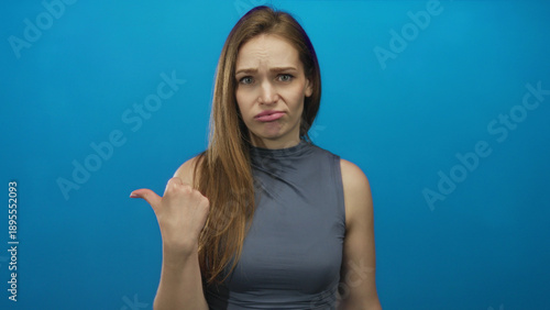 © Krakenimages.com, Fototapeta premium Woman in sleeveless gray top frowning with dramatic thumb pointing to side in blue studio setting; disgust.