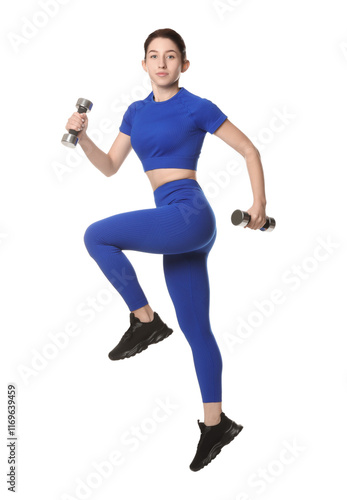 Fototapeta premium Woman in sportswear exercising with dumbbells on white background