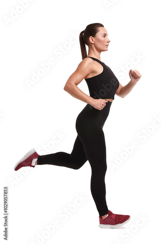 Obraz premium Woman in sportswear running on white background