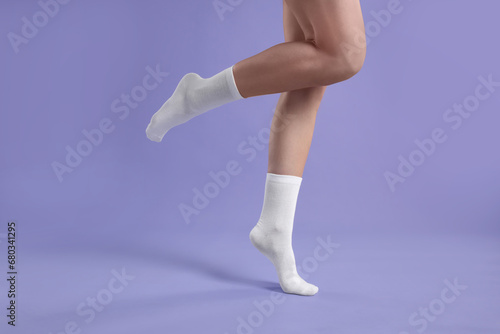 Fototapeta premium Woman in stylish white socks on violet background, closeup
