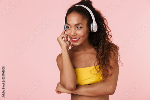 © Drobot Dean, Fototapeta premium Woman in swimwear posing isolated over pink background listening music with headphones.