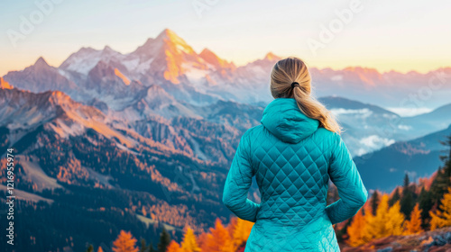 © sommersby, Naklejka premium Woman in Teal Jacket Admires Majestic Autumn Mountain Range at Sunrise