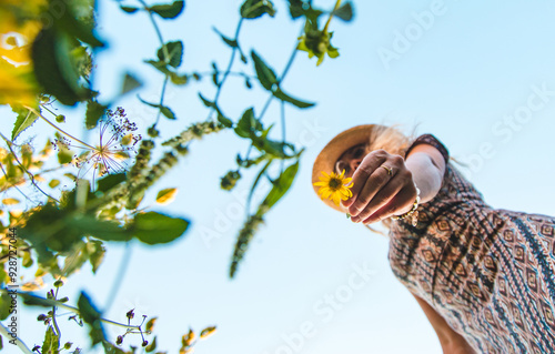© yanadjan, Obraz premium Woman in the park with flowers summer. Selective focus.