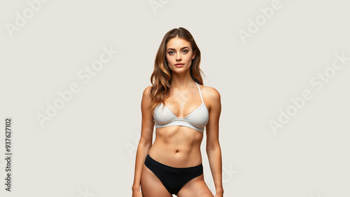 © overrust, Naklejka premium woman in underwear on beige pastel background