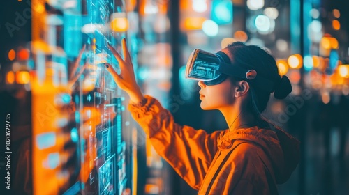 © Rere_Art151, Obraz premium Woman in VR Headset Interacting with Digital Interface