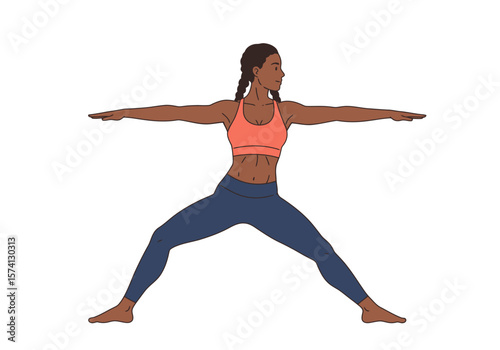 Obraz premium Woman in Warrior II Pose with Braids Wearing Coral Top and Blue Leggings.